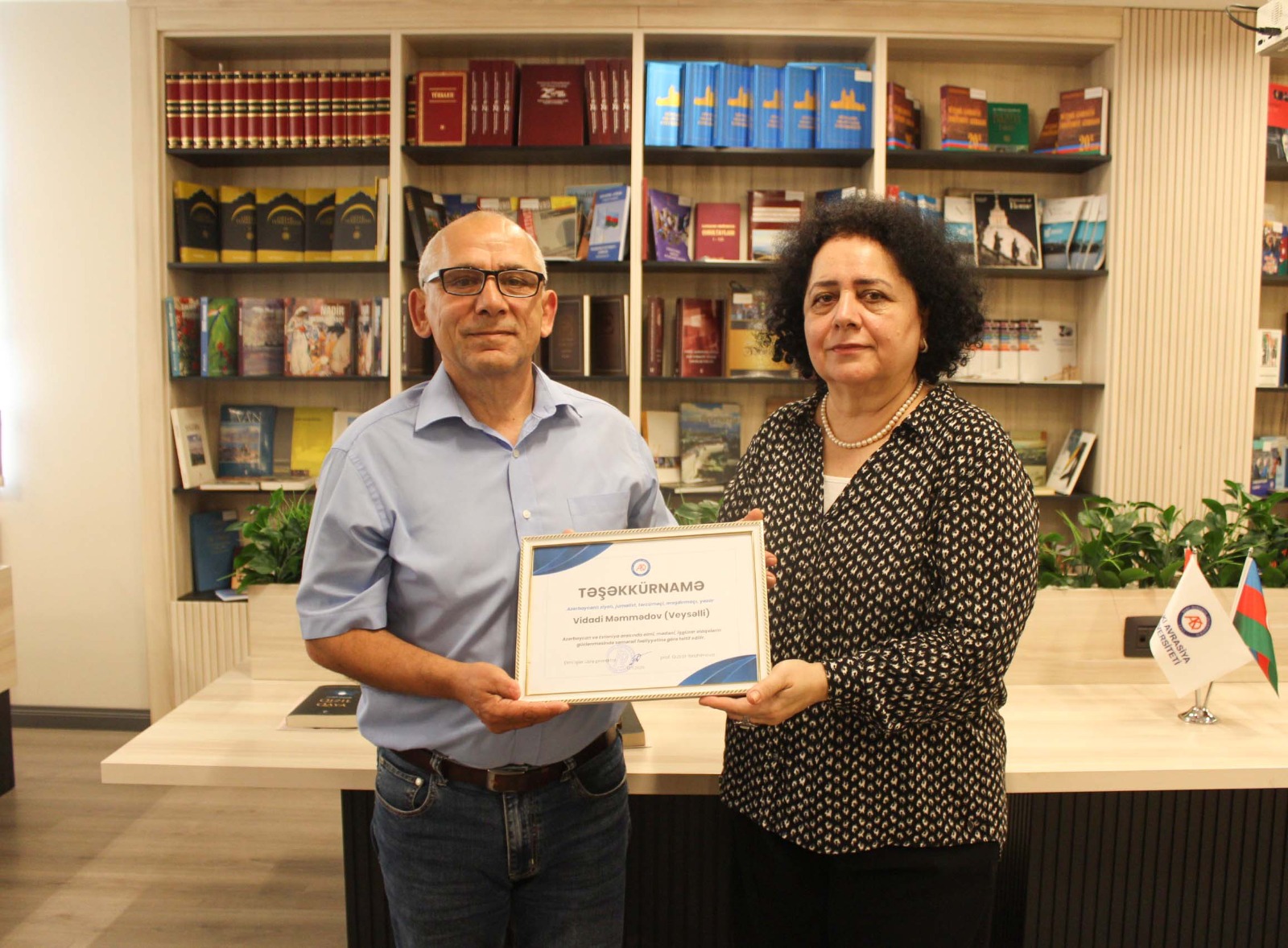 Sonda Vidadi Məmmədov iştirakçılarla xatirə şəkli çəkdirib və müəllifi olduğu “Qızıl Qaya” və “İynə Doktor” kitablarını BAAU-nun Kitabxana və İnformasiya Mərkəzinə, müəllim və tələbələrə hədiyyə edib.