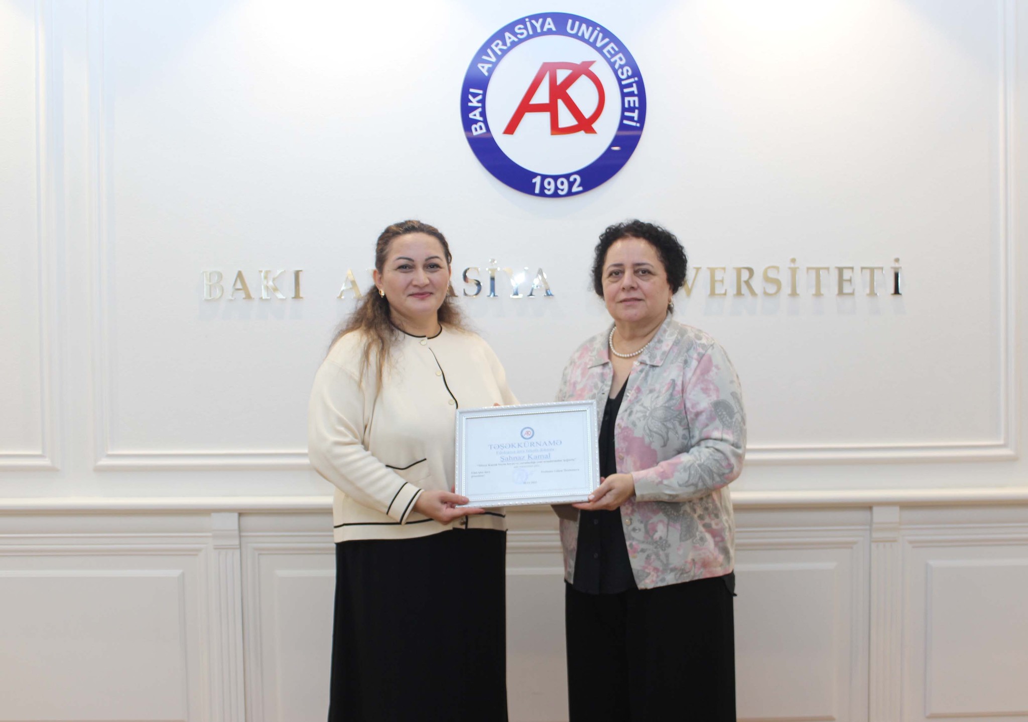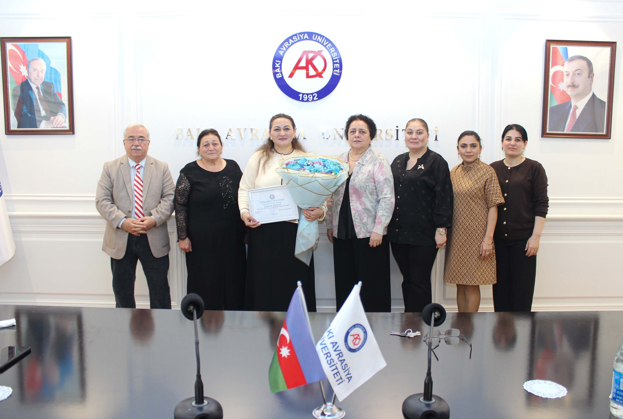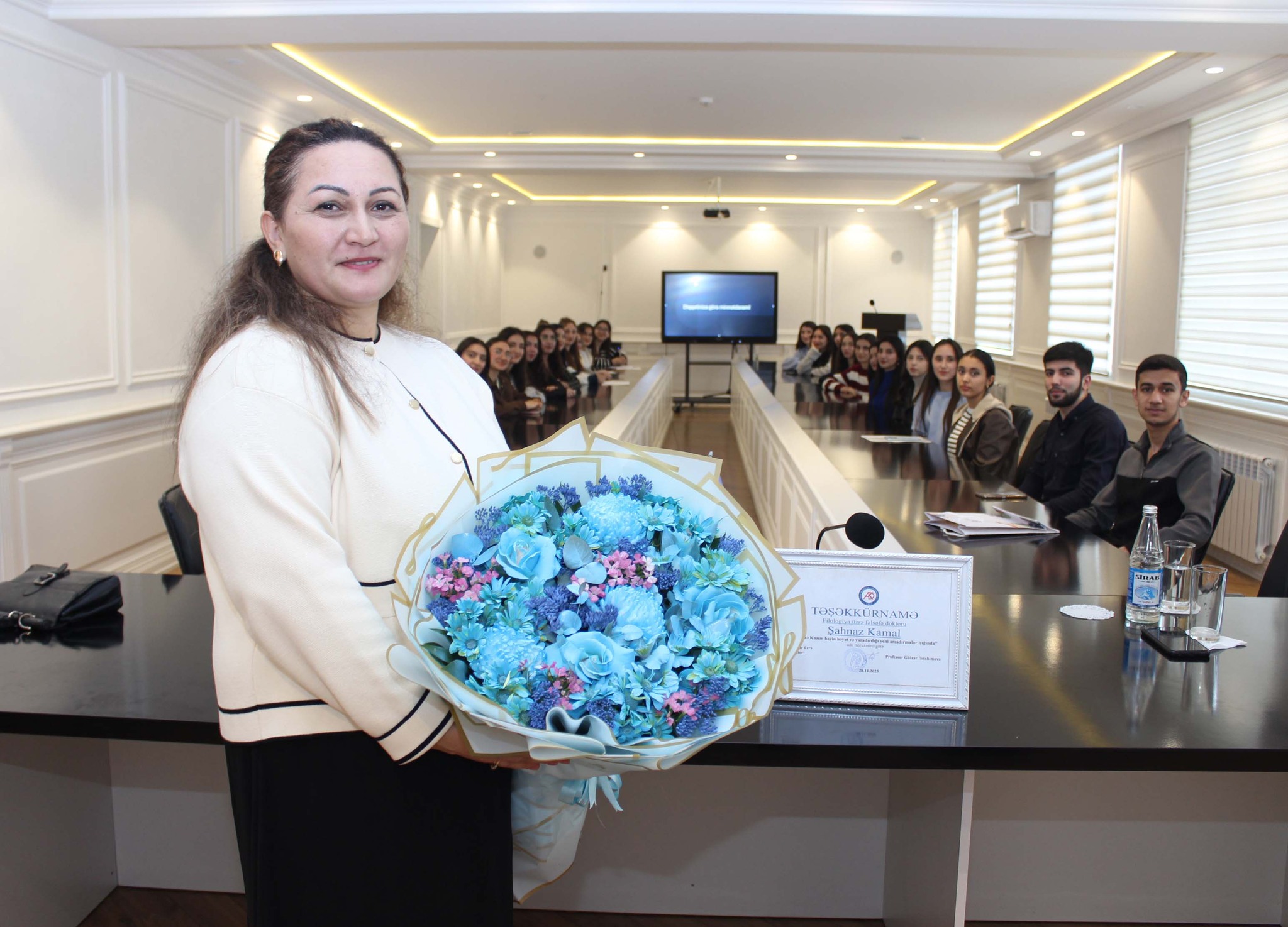 Tədbirin sonunda professor Gülzar İbrahimova qonağa Təşəkkürnamə təqdim edib, daha sonra iştirakçılarla xatirə şəkilləri çəkilib.