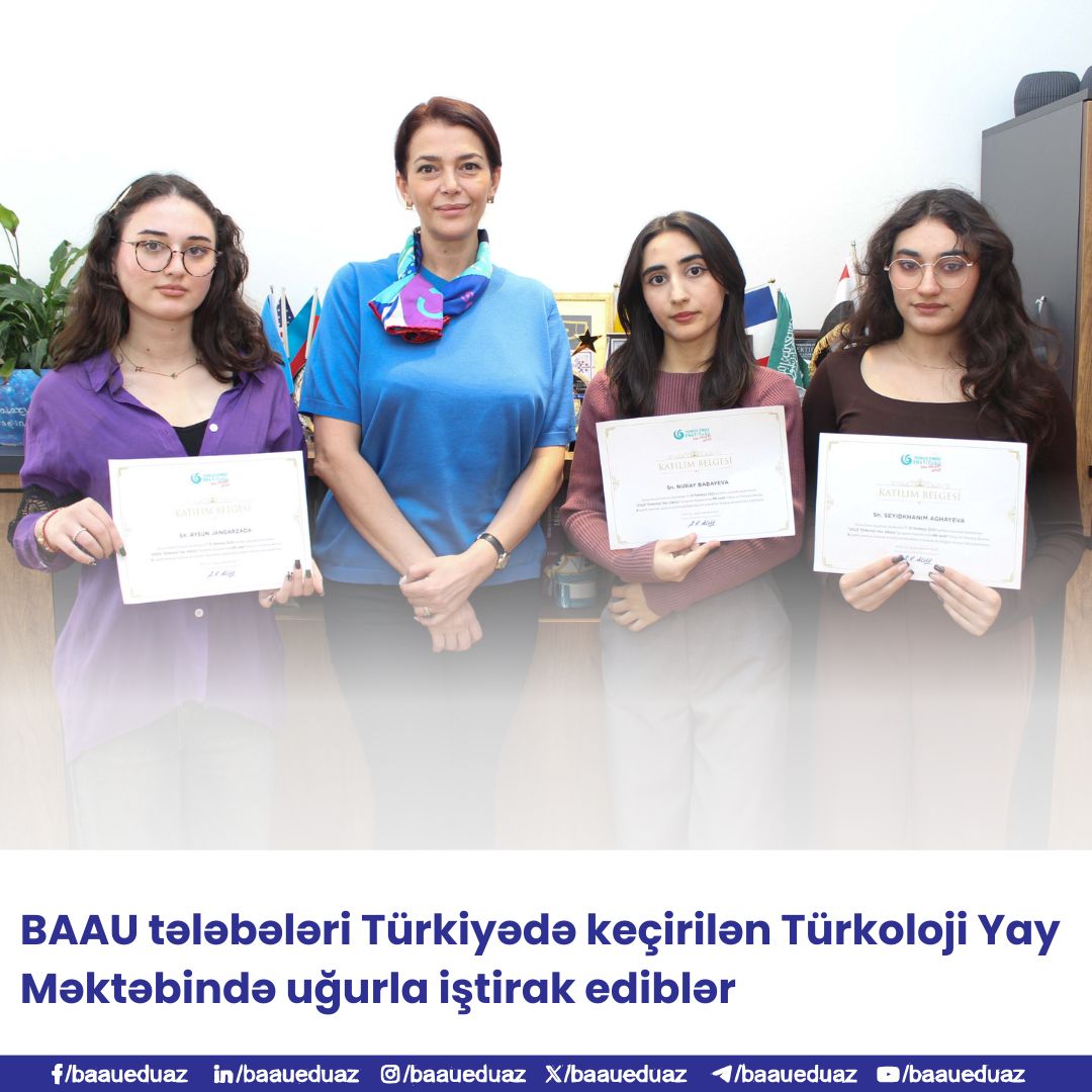 Bakı Avrasiya Universitetinin (BAAU) Filologiya fakültəsinin Filologiya - türk dili və ədəbiyyatı ixtisası üzrə təhsil alan tələbələri: Canqarzadə Aysun, Ağayeva Seyidxanım (III kurs) və Babayeva Nuray (IV kurs) yay məktəbində universitetimizi təmsil edərək yüksək akademik göstəriciləri və fəallıqları ilə fərqləniblər.