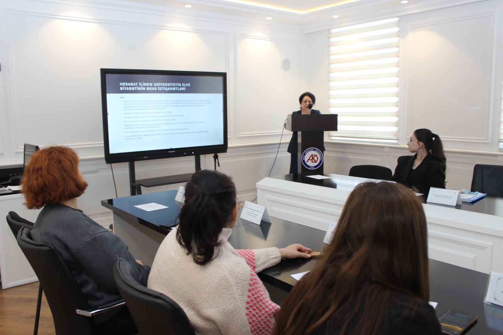 İlk olaraq 2025-ci təqvim ili üzrə elmi fəaliyyətin yekunları və qarşıda duran vəzifələr barədə məruzə təqdim olunub. Elmi işlər üzrə prorektor, professor Gülzar İbrahimova universitetdə aparılan elmi-tədqiqat işlərinin nəticələri, əldə edilmiş nailiyyətlər və gələcək inkişaf istiqamətləri barədə ətraflı məlumat verib.