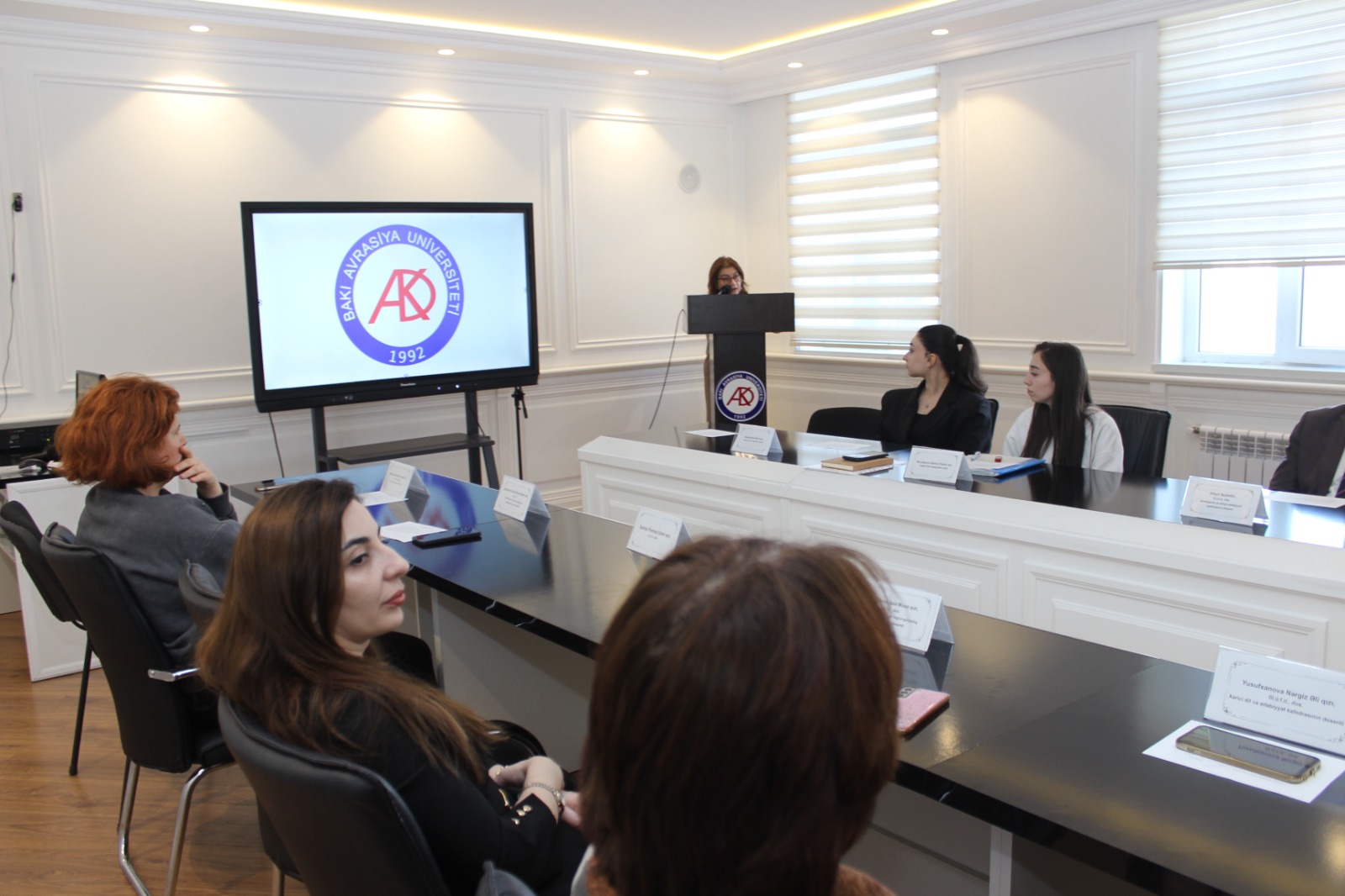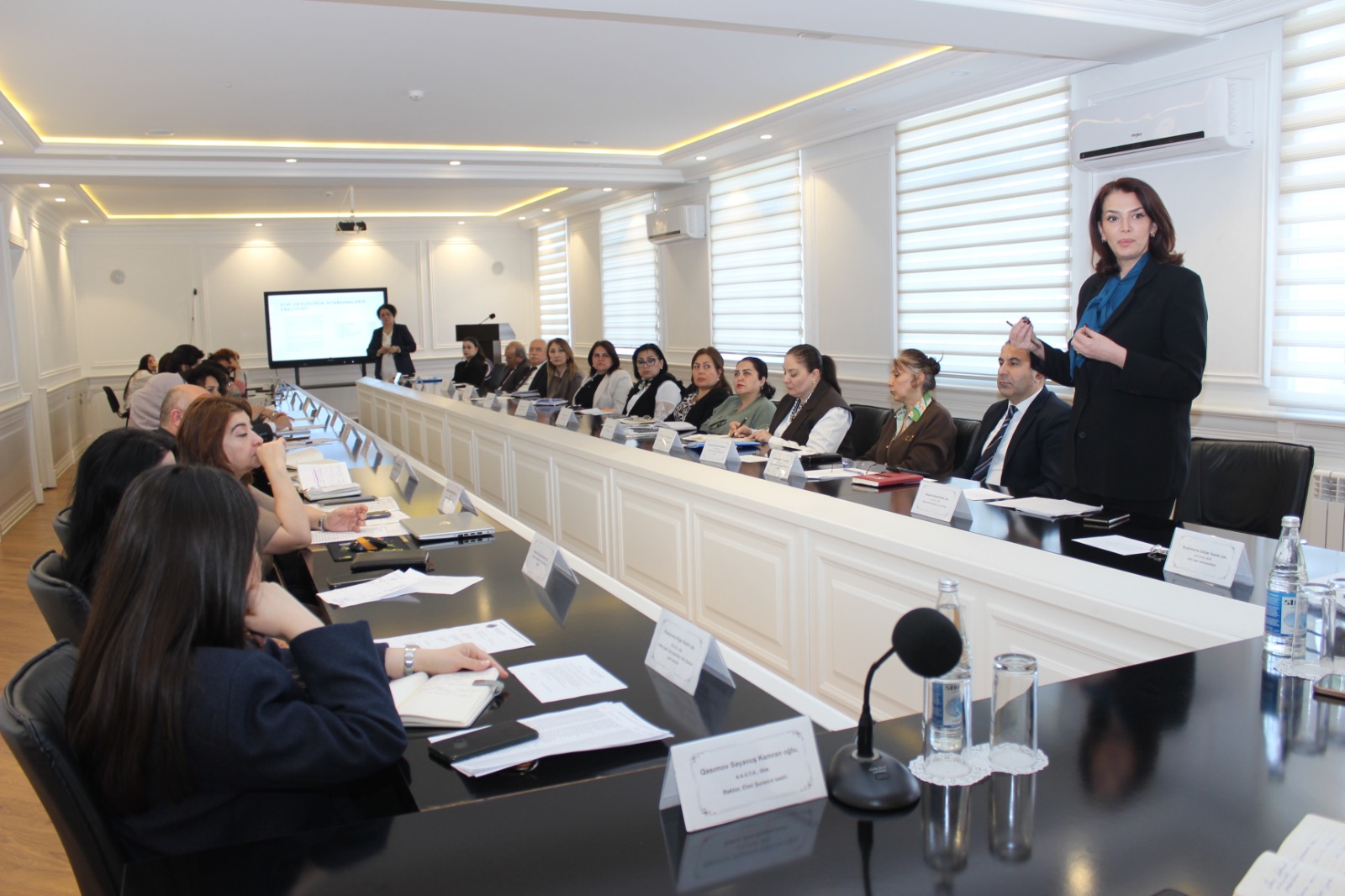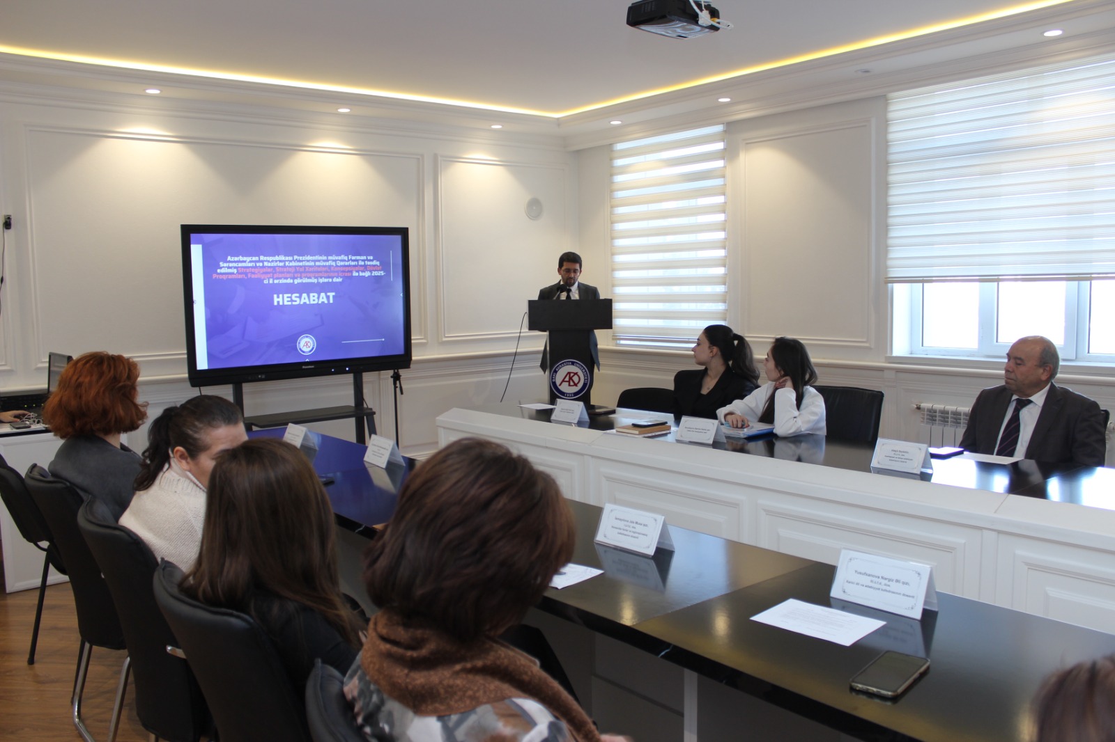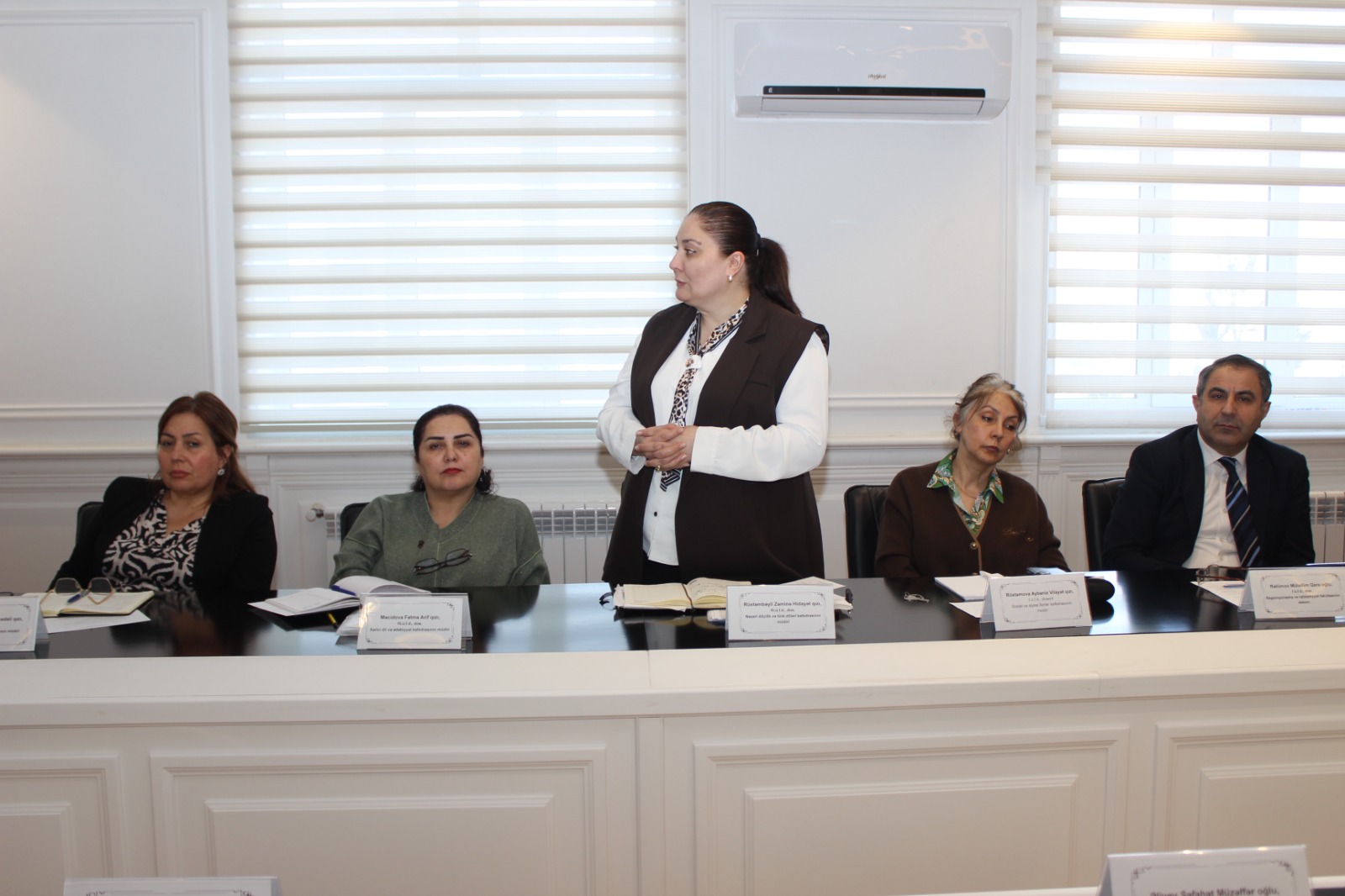 Daha sonra 2025/2026-cı tədris ilinin I yarısında tədris prosesinin təşkili və həyata keçirilmə vəziyyəti müzakirə edilib. Tədrisin təşkili departamentinin rəhbəri, fil.ü.f.d. Natella Quliyeva tədris keyfiyyətinin artırılması istiqamətində görülmüş işlər, tətbiq olunan yeniliklər və mövcud vəziyyət barədə hesabatla çıxış edib.