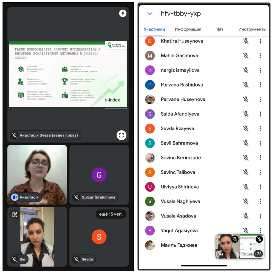 Bakı Avrasiya Universitetinin (BAAU) Elm, innovasiya və doktorantura sektoru ilə Ukraynanın Elmi Nəşrlər şirkətinin birgə təşkilatçılığı ilə elmi fəaliyyətin qiymətləndirilməsi və tədqiqatçıların beynəlxalq elmi mühitdə mövqelərinin gücləndirilməsi məqsədilə H-indeks və elmi göstəricilərin artırılması mövzusunda vebinar təşkil olunub. Vebinarda BAAU-nun professor – müəllim heyəti, doktornatları və magistrantları fəal iştirak etmişdir.