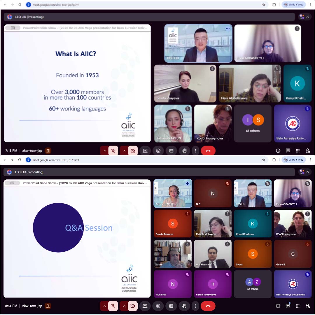 “From Principles to Practice: AIIC, Professional Ethics, and the Challenges Redefining the World of Conference Interpreting” mövzusunda baş tutan tədbir Google meet platforması üzərindən onlayn formatda Tərcümə kafedrasının baş müəllimi Elvin Abbasbəylinin moderatorluğu ilə təşkil olunub.