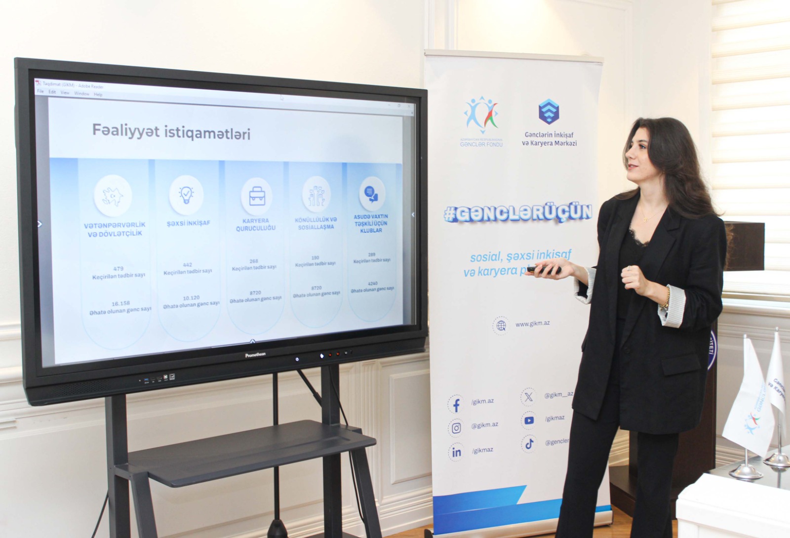 İnfosessiyada GİKM-in Layihələrin və proqramların idarəedilməsi şöbəsinin müdiri Jalə Həsənova və həmin şöbənin baş mütəxəssisi Ramilə El-oğlu təqdimatla çıxış ediblər. Natiqlər mərkəzin icra etdikləri proqramlardan, həmçinin gənclərin şəxsi və peşəkar inkişafının dəstəklənməsi, karyera planlamasının təşkili, təcrübə və könüllülük fəaliyyətlərinin genişləndirilməsi istiqamətlərində həyata keçirdiyi layihələr barədə ətraflı məlumat veriblər.